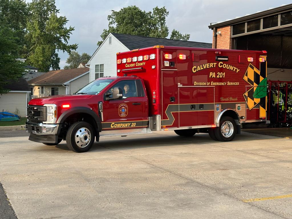 You may notice the Calvert EMS unit assigned to North Beach sporting a new transport vehicle decked out in the Calvert EMS livery. Paramedic 201 is a 2024 Horton ambulance box mounted on a Ford F550 chassis.