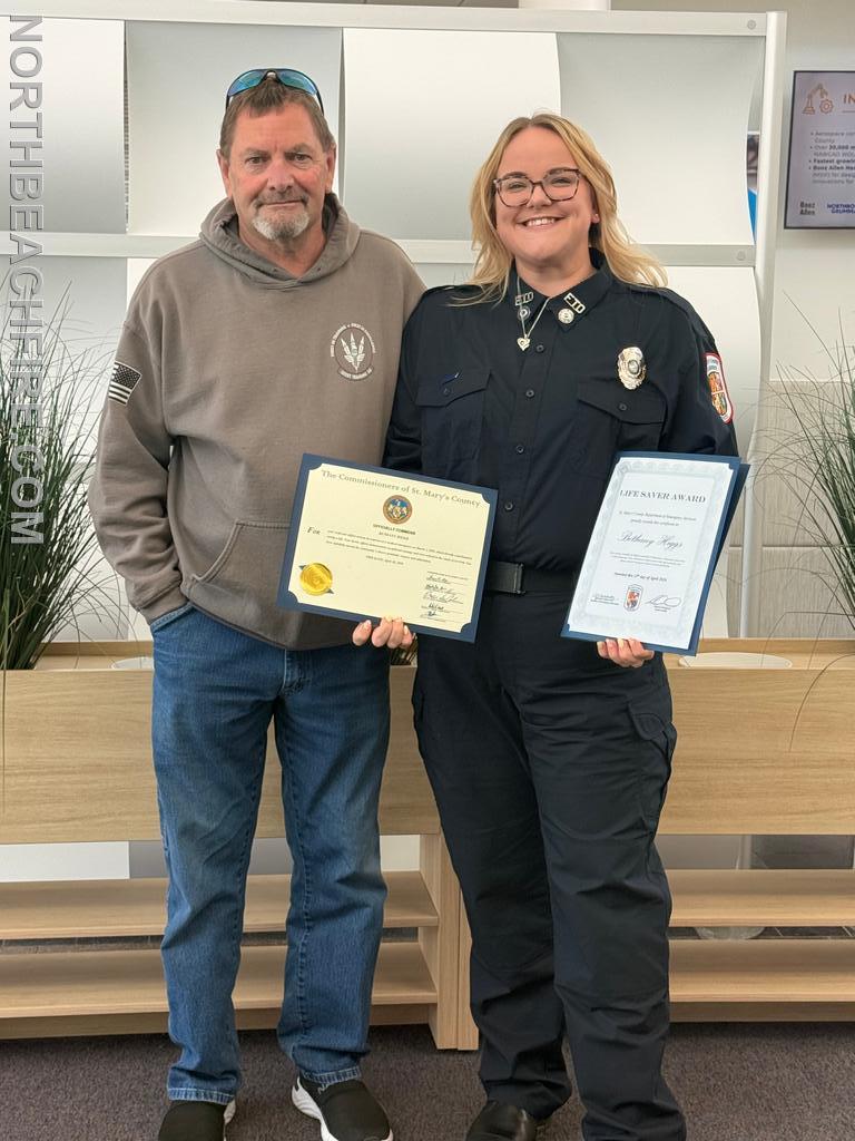 North Beach EMS sergeant Bethany Higgs was recognized on Monday, April 20, 2026, with a life-saving award for actions at her full-time job with St. Mary’s County EMS. Bethany was part of a crew that responded to a call for a 50-year old male with chest pains. Upon arrival, Bethany and her partner recognized the patient was experiencing a major cardiac event. They quickly called for additional resources, including aviation for a fly out to Washington Hospital Center (WHC). The patient went into cardiac arrest at the landing zone. He was revived and flown to WHC where he was successfully treated. Bethany, the crews involved, and the patient were reunited at today’s ceremony in St. Mary’s. Congratulations to Bethany, and all those involved. Job well done!